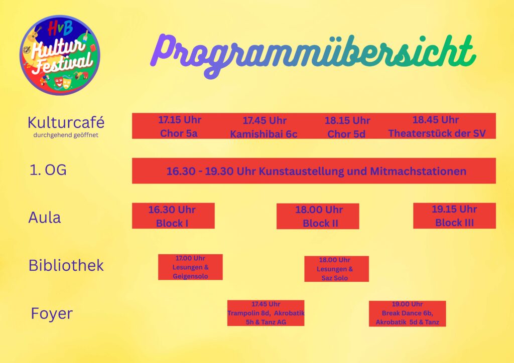 12. März 2026In diesem Jahr findet am 26.3. von 16.30 – 19.30 Uhr erstmals unser Kulturfestival mit dem Thema „Vielfalt“ statt. Besucherinnen und Besucher erwartet ein abwechslungsreiches Programm mit Kunstausstellung, Sportbeiträgen, Beiträgen in der Bibliothek, dem Kulturcafé sowie Bühnenauftritten in der Aula.