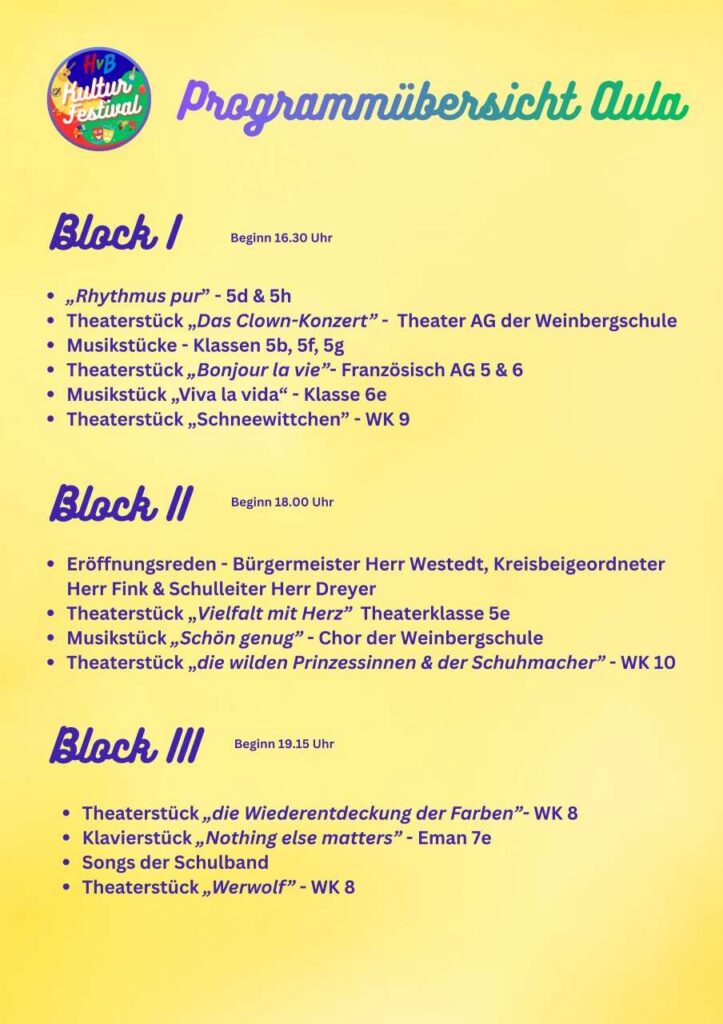 Die Abendveranstaltung in der Aula ist in drei Programmblöcke unterteilt. Für jeden Block wird zusätzlich zum Festivalbändchen eine eigene Blockkarte benötigt. Eine Blockkarte kostet 50 Cent.