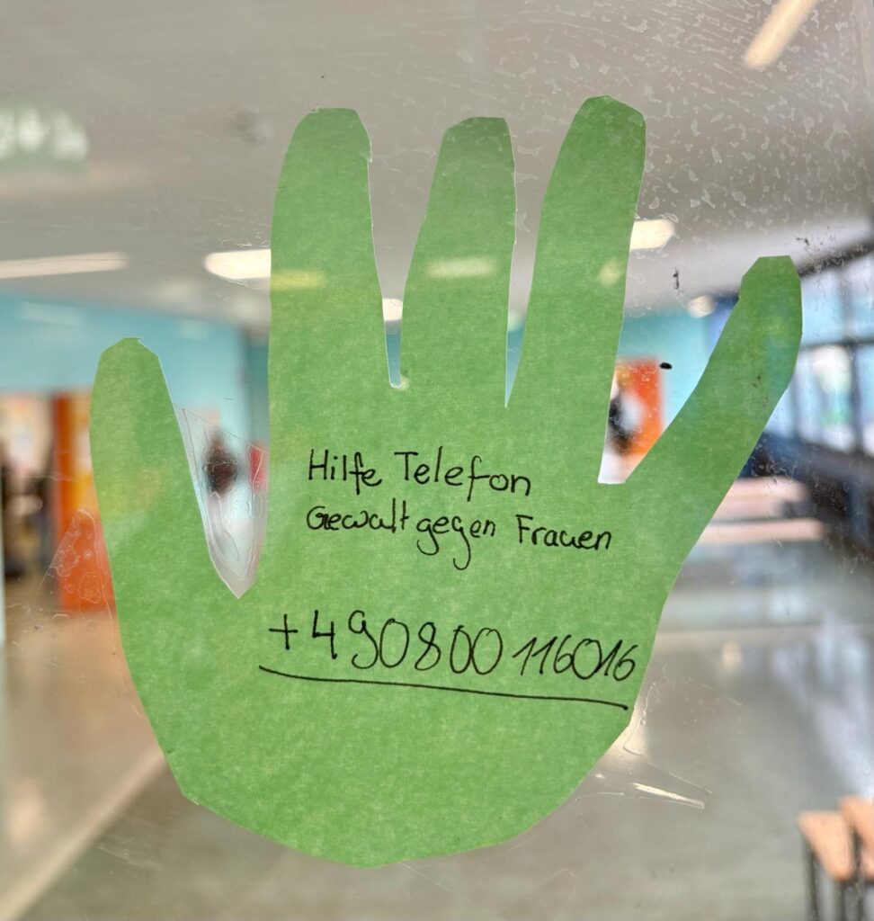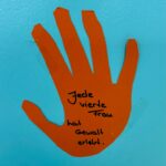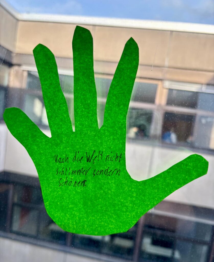 Ergänzt wurde dies durch grüne Hände, die für Hoffnung, Unterstützung und Solidarität stehen. Darauf hielten die Kinder Hilfesysteme, Beratungsstellen und Anlaufpunkte fest oder formulierten ermutigende Worte, die Betroffenen Stärke und Zuversicht vermitteln sollen.