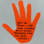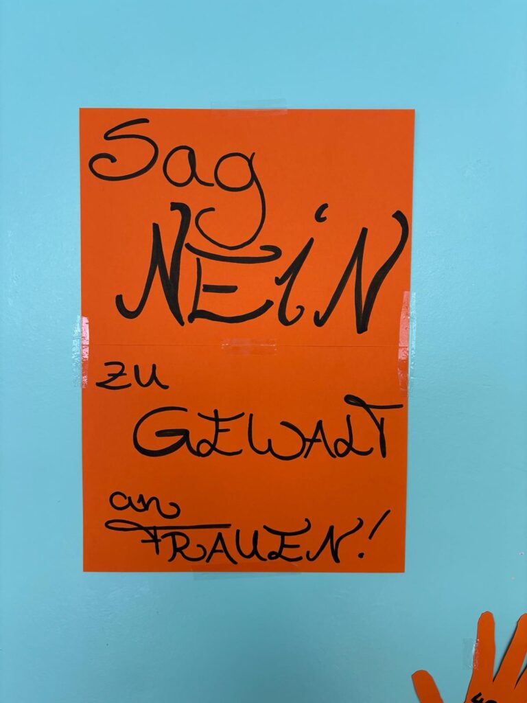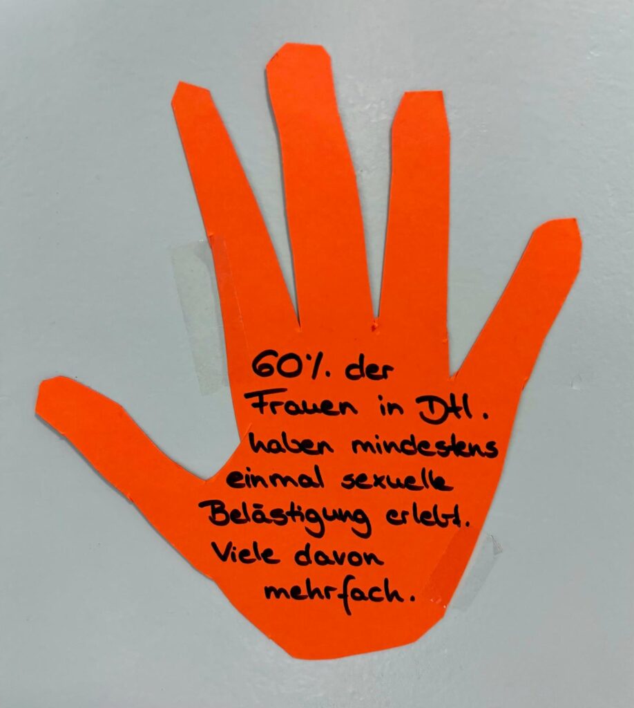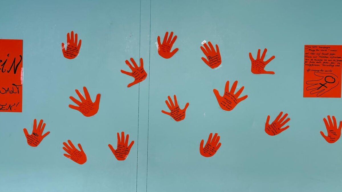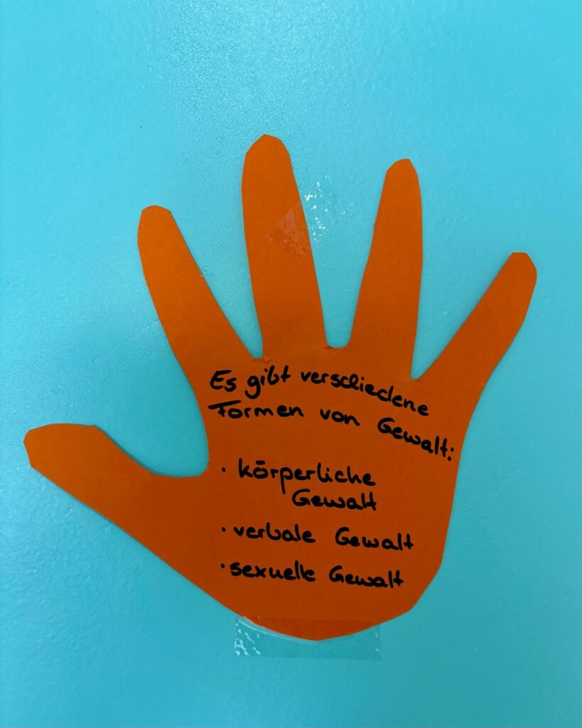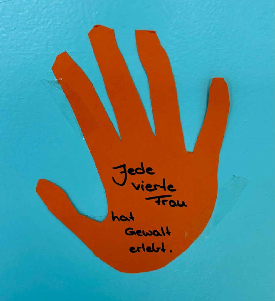 Im Anschluss gestaltete die Klasse eine eindrucksvolle Wall of Shame: Auf orangefarbenen Händen, dem offiziellen Symbol der Orange Week, sammelten die Schülerinnen und Schüler Fakten zur Häufigkeit und zu den verschiedenen Formen von Gewalt gegen Frauen. Die Wand macht sichtbar, wie verbreitet dieses Problem ist – und wie wichtig es ist, nicht wegzuschauen.