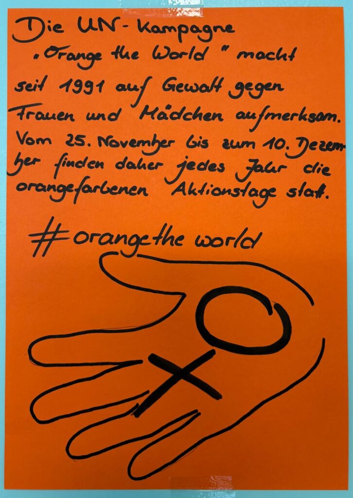 12. Januar 2026In diesem Jahr hat die Heinrich-von-Brentano-Schule an der internationalen Orange Week teilgenommen. Diese Aktionswoche macht weltweit auf Gewalt gegen Frauen aufmerksam und möchte Mut machen, Betroffene zu unterstützen, über das Thema ins Gespräch zu kommen und gesellschaftliche Verantwortung zu übernehmen.