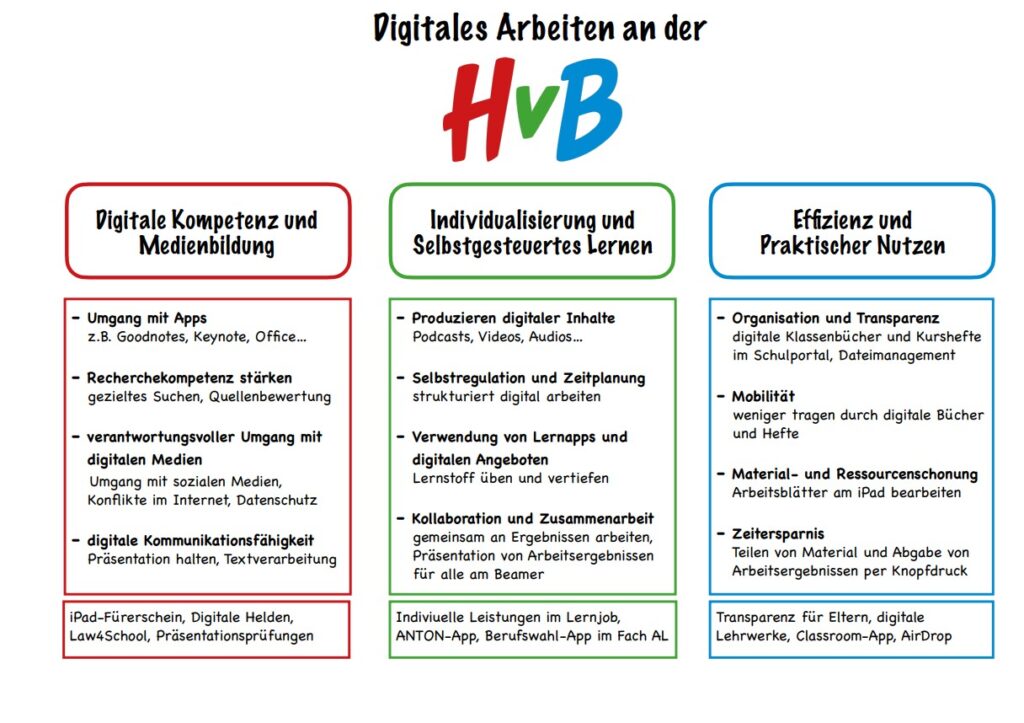 An der Heinrich-von-Brentano-Schule erlernen Schülerinnen und Schüler im Rahmen unseres Medienkonzeptes von Anfang an den Umgang mit digitalen Medien und erfahren, wie diese sinnvoll im Unterricht einsetzen. Hierzu stehen den Schülerinnen und Schülern moderne Tablets als Leihgeräte zur Verfügung. Auch zwei Computerräume sowie moderne Präsentationsmedien können im Unterricht genutzt werden. Im Rahmen unserer Themenklassen „Digitale Medien“ können Schülerinnen und Schüler schon ab Jahrgangsstufe 5 ihren Schwerpunkt entsprechend setzen. Auch in unseren Wahlpflichtkursen ab Jahrgang 7 ist es möglich, zusätzlich digitale Akzente zu setzen. Ein Team von Lehrkräften engagiert sich zusätzlich in einer Arbeitsgruppe „Medienkompetenz“, um die Schulentwicklung im Bereich des digitalen Lernens an der HvB voranzutreiben.