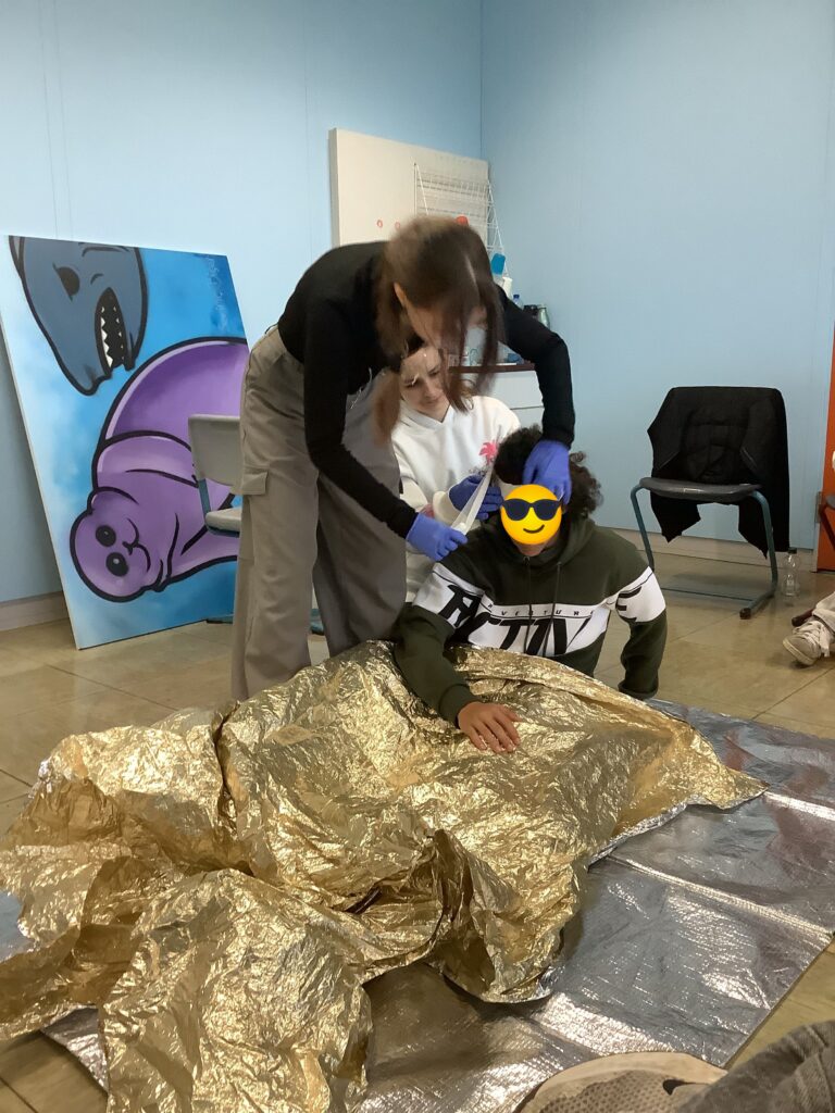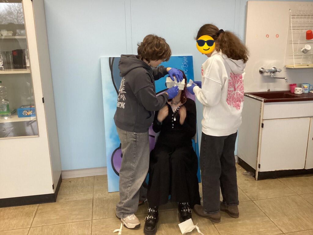 Besonders praktisch wurde es bei den Verbandsübungen: Hier entstanden so manche interessanten Kunstwerke an Armen, Beinen und Köpfen. Schnell wurde deutlich, dass es dabei nicht um Schönheit, sondern um Zweckmäßigkeit und Sicherheit ging – eine wichtige Erkenntnis für den Ernstfall.