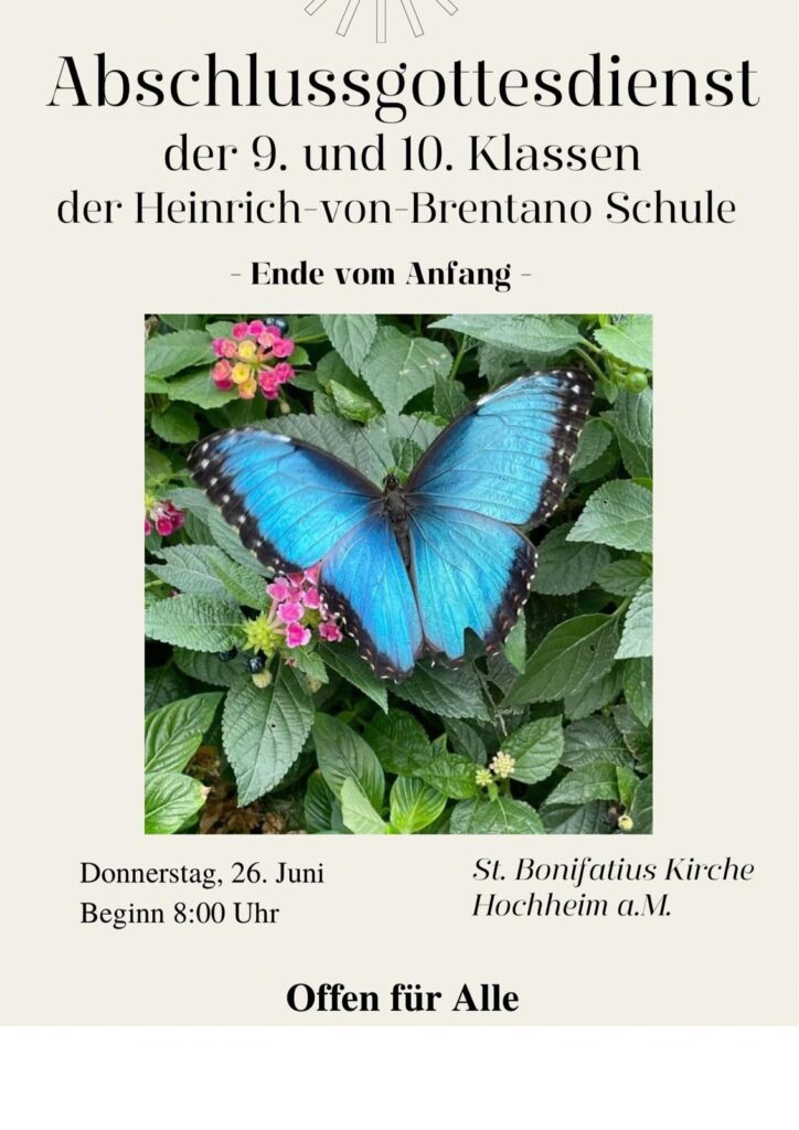 Am Donnerstagmorgen fand in der St. Bonifatius Kirche in Hochheim unser diesjähriger Gottesdienst zum Schuljahresende statt. Unter dem Motto „Anfang vom Ende“ versammelten sich die 9er und 10er zu einem gemeinsamen Ritual der Verabschiedung.